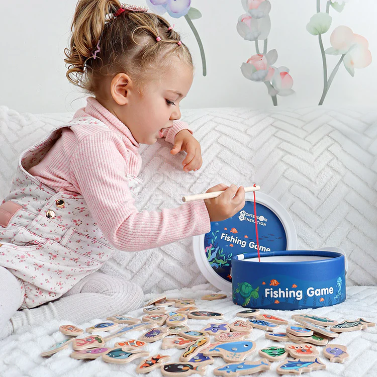 Montessori-Angelspiel – Ein magnetisches Holzspiel mit 51 bunten Fischen und 3 Angelruten. Kinder üben ihre Hand-Augen-Koordination und lernen, die Fischarten zu benennen, während sie Fische „fangen“ und sammeln.